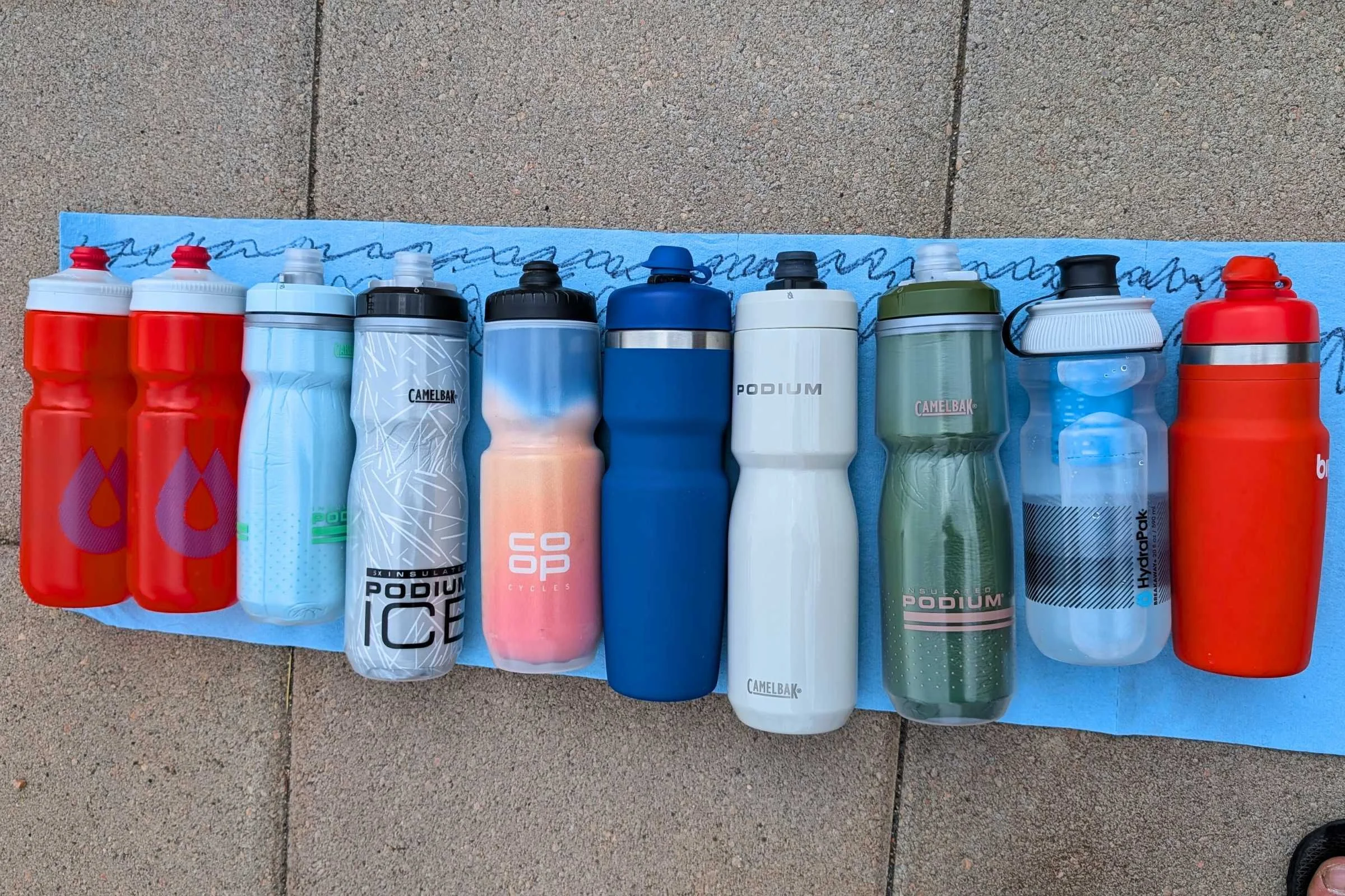 We tested 11 bottles side-by-side, assessing the flow rate by spraying them into our mouths and assessed each bottle for leaks overnight. We filled them with ice water and left them in the hot sun to see how insulated each model was. We also used every bottle on our bike to see how well they worked for staying hydrated while actively riding. And we carried them around to drink out throughout our daily riding and testing to get a sense of each model, how well it works one-handed, and whether it will fit the smallest bike frames.