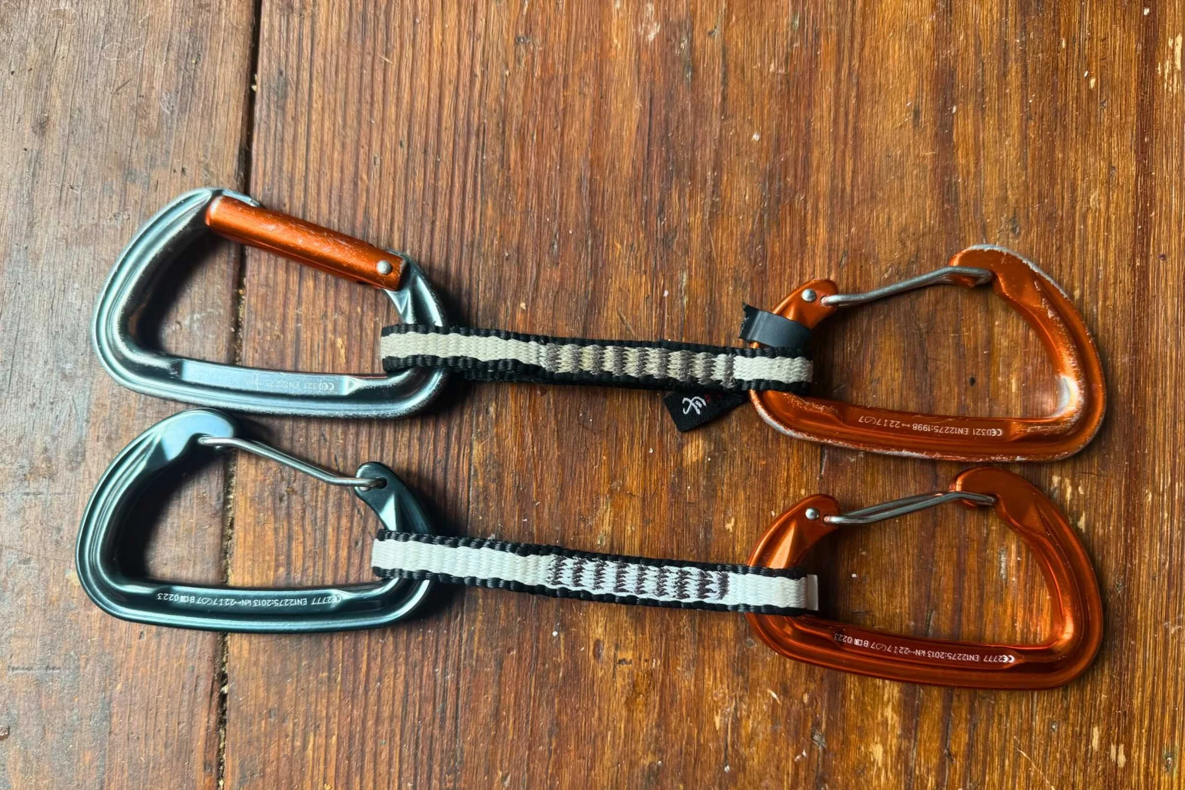 Most quickdraws use the same type of carabiner on each end, but some will opt for a bent gate on the rope end and a straight gate on the stone side. In some cases, they’ll put a solid gate on the loose, sling side of the quickdraw and a wiregate on the fixed rope side. This helps reduce the likelihood of the bolt catching on the hook nose of a wire carabiner.