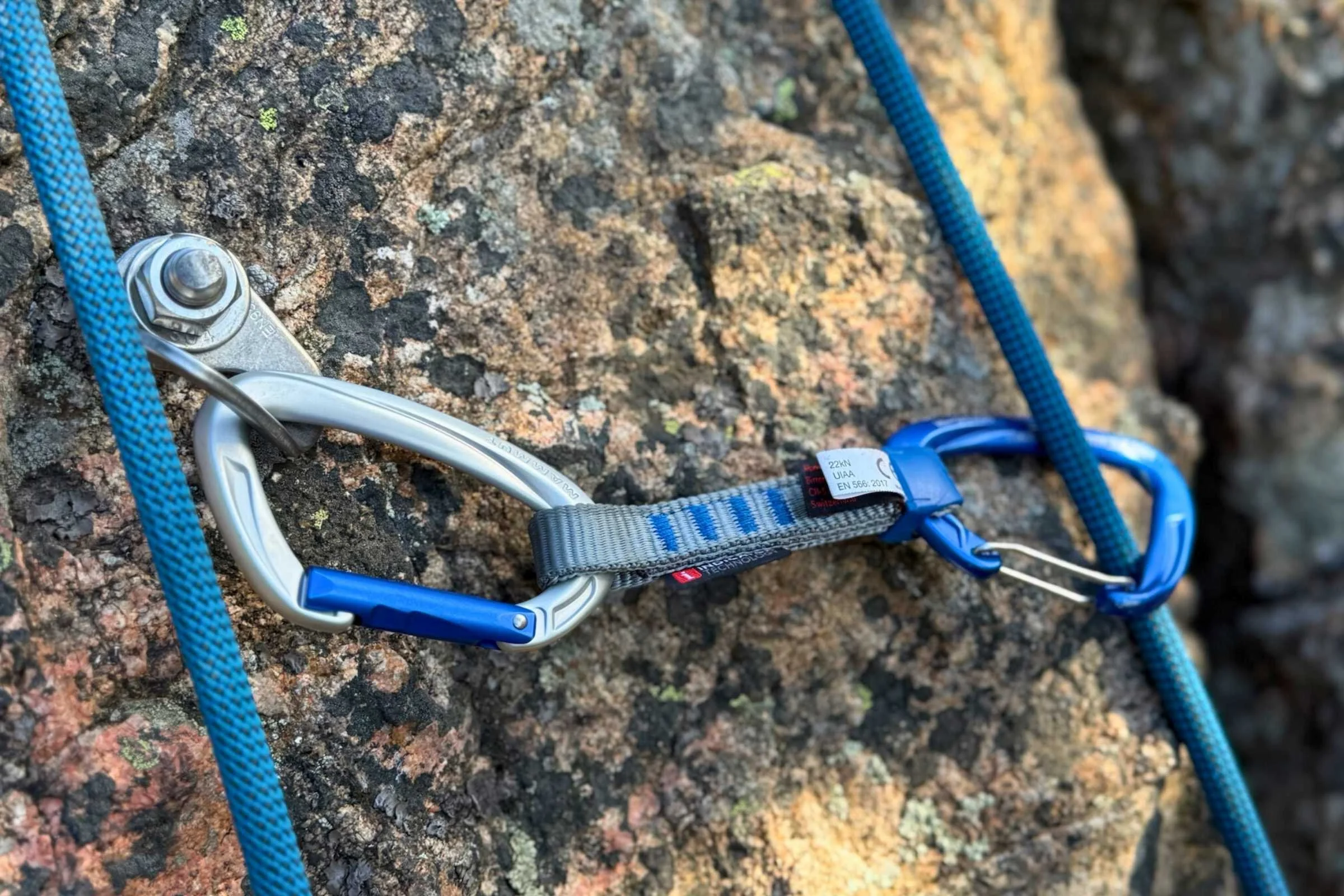 It’s lighter than the Black Diamond Hotforge Hybrid despite having two solid, keynose gate carabiners, compared to the Hybrid’s one wire and one solid gate carabiner. We also like the knurling on the gate of the bolt side and flat front on the bent gate on the rope side, making it really easy to clip into a rope.