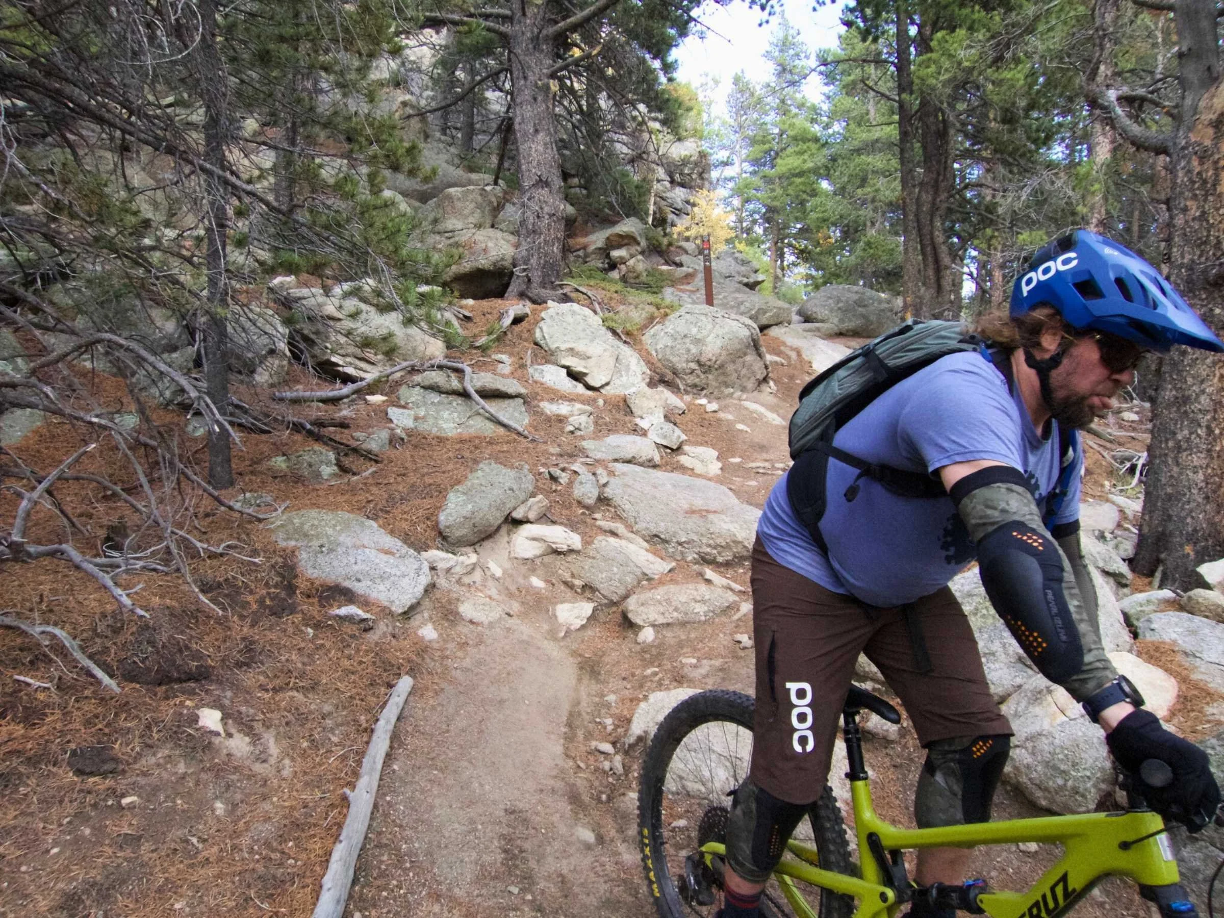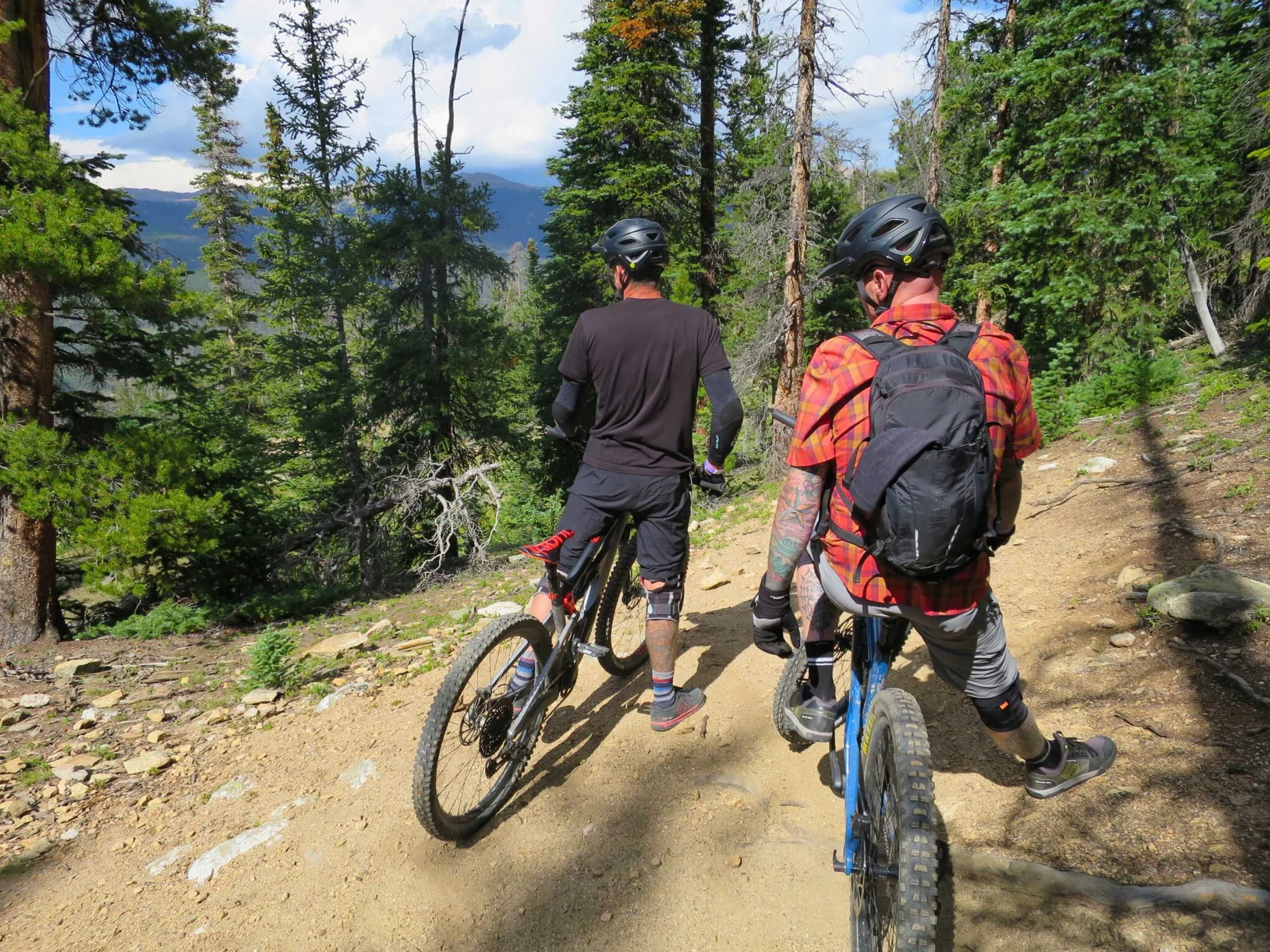 Evaluating the next trail at Keystone while testing elbow pads.