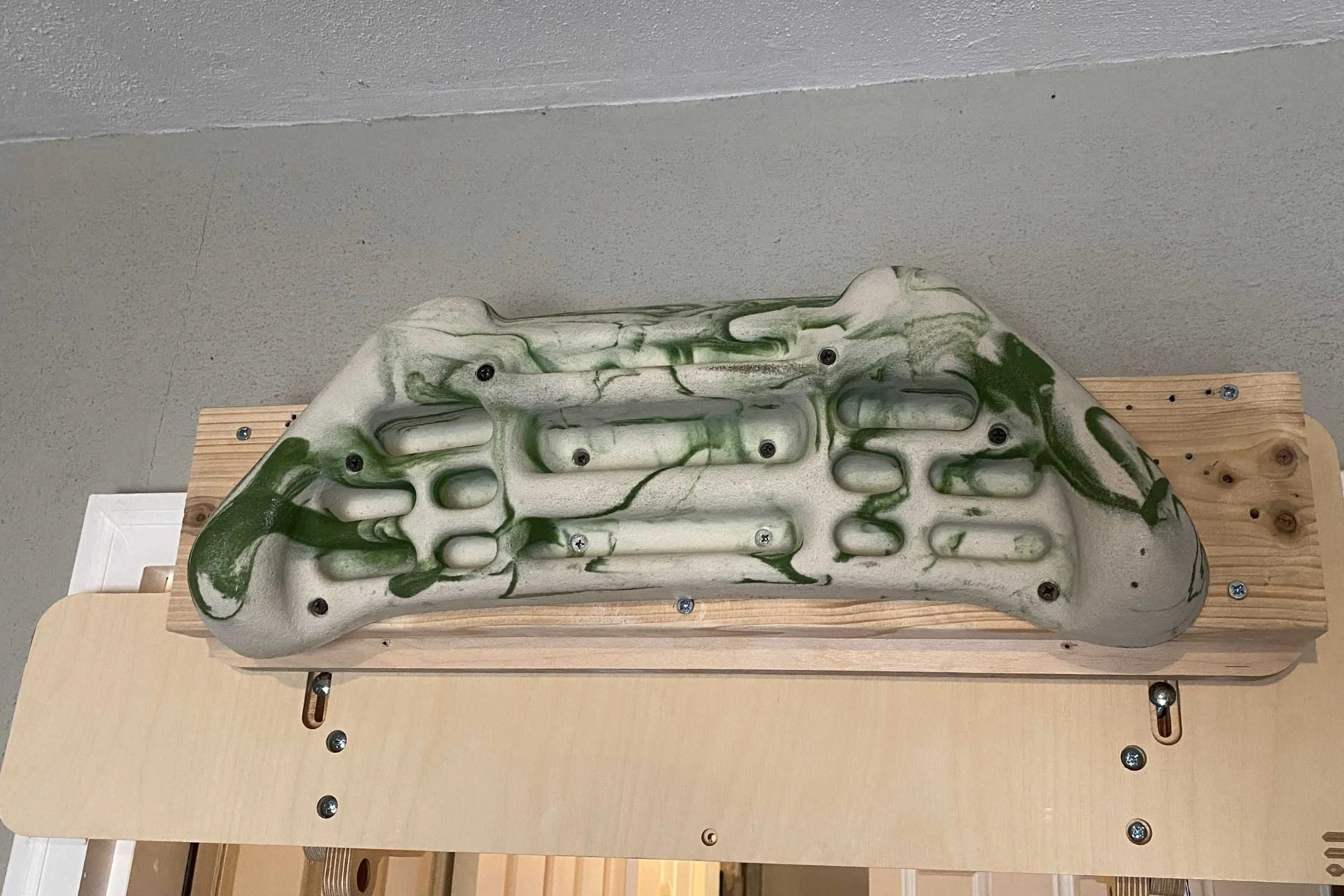 To start off, it was the only hangboard we tested that didn’t come with mounting screws. So before you do anything, you’ll have to measure the depth of your mounting setup, along with the depth of the holes in the hangboard, and go buy some wood screws.