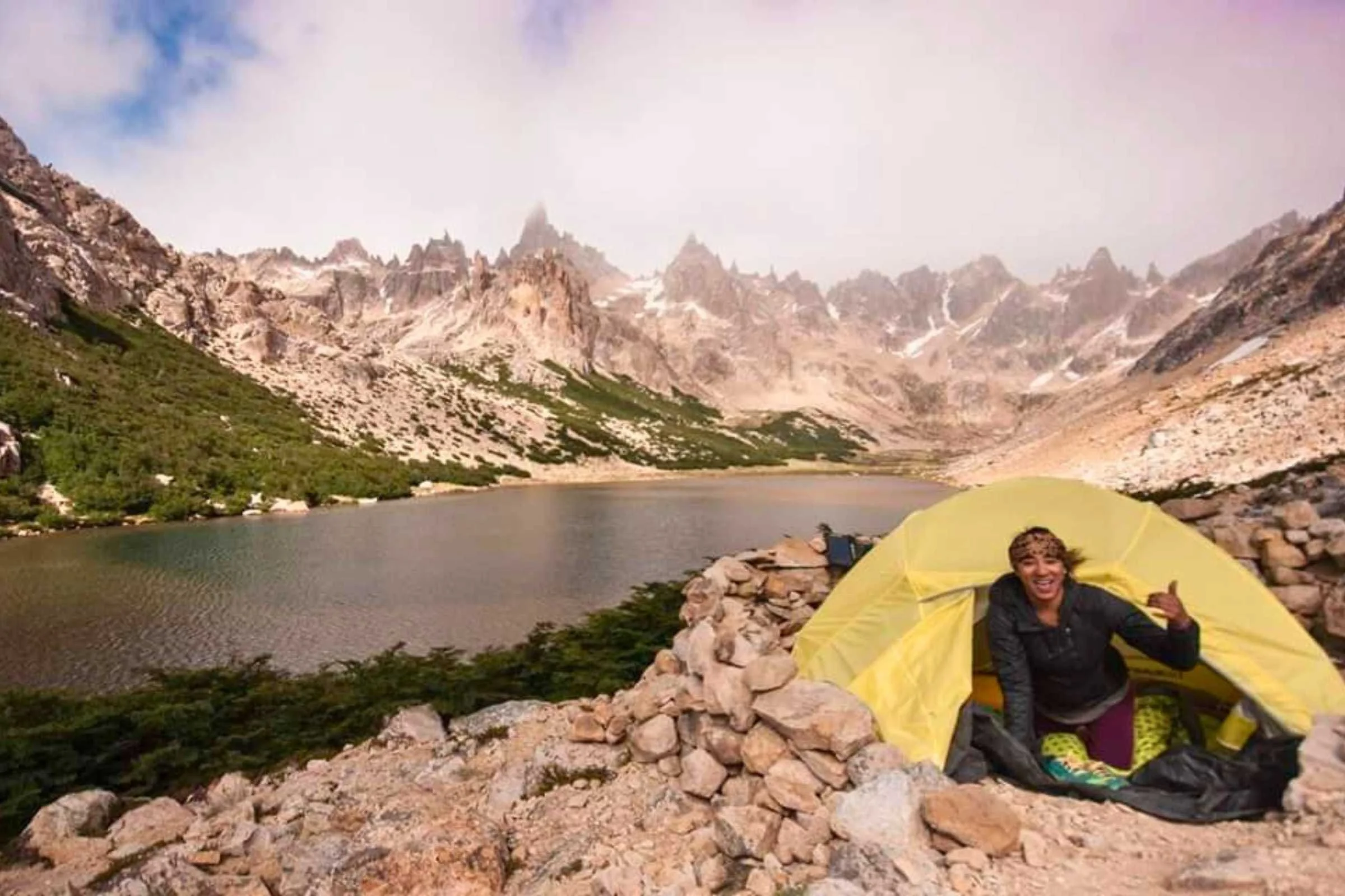 The author on a rest day at camp after climbing on a rest day in Argentinian Patagonia in 2015. She did not have hiking sandals, but doesn't regret the faint scars (literally, ripped open a foot) she has from walking barefoot along an alpine lake. Photo credit: Loreah Winlow