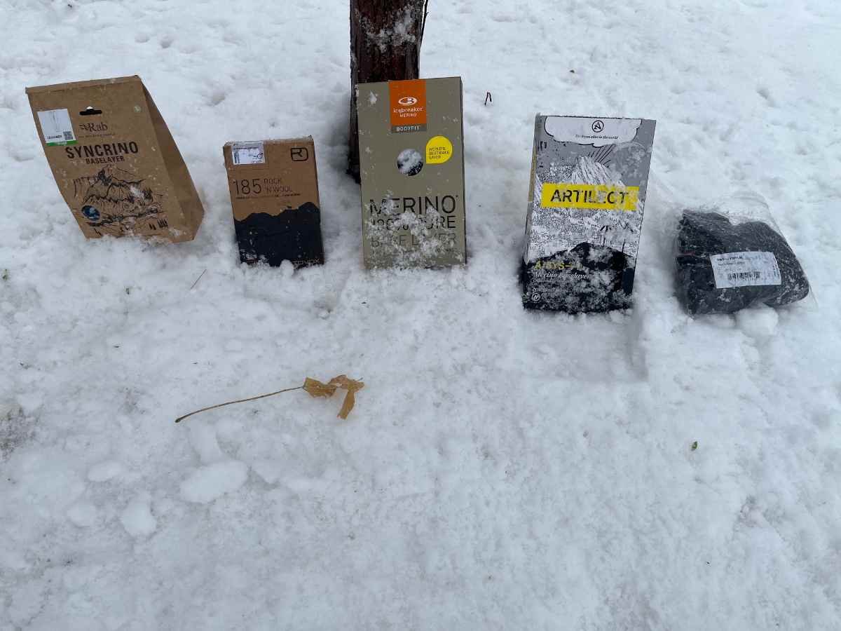 How different base layers we tested arrived. From L-R most to least sustainable. Photo courtesy Chris Meehan.