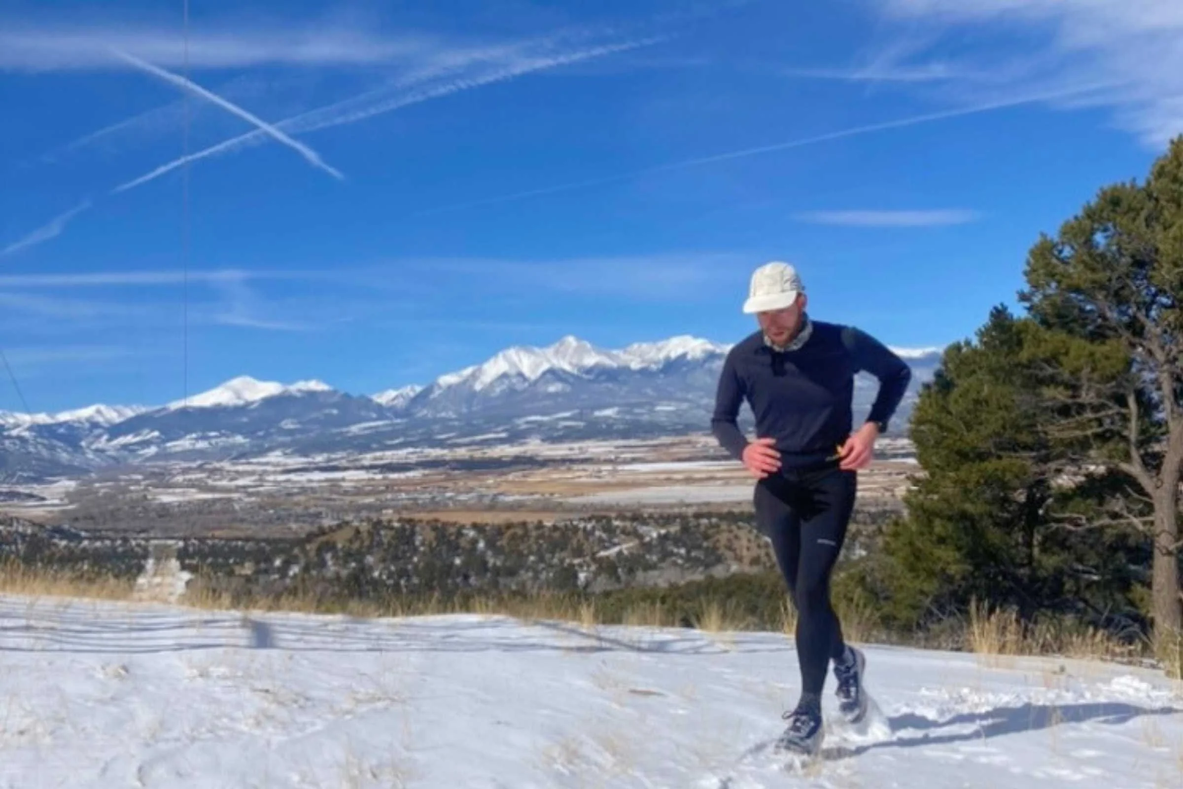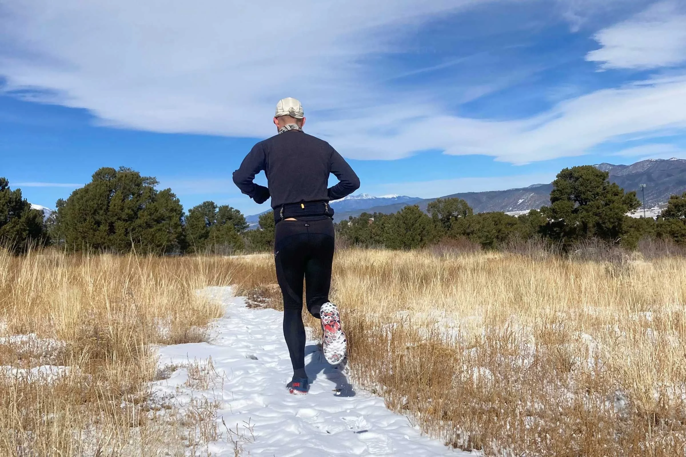 The author running in light amounts of snow testing options for the best running tights. Here, he is wearing the Janji Trail TIghts. Photo by Justin Walker.