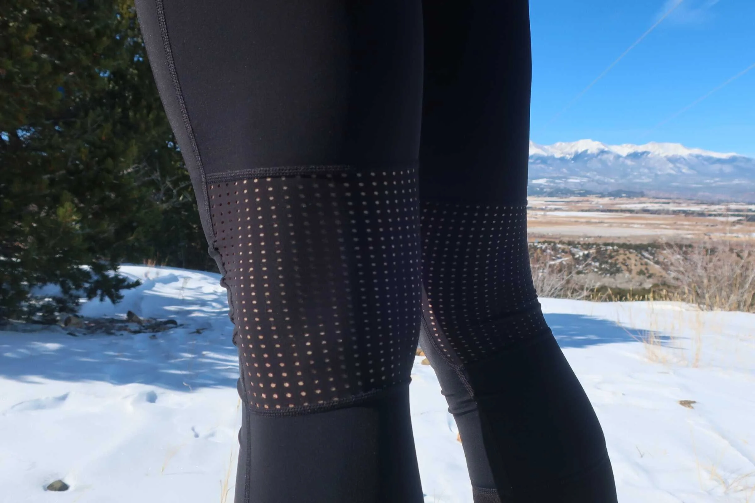 Though there’s a lot of discourse about keeping warm from wearing running tights, a part of the equation of staying warm, especially with a high output activity like running, is ventilation and general breathability. Sometimes tights will be thinner behind the knee and other parts of the tight where high heat output occurs. Ventilation is closely tied with the idea of wicking, in that sweat transfers from the skin to the outer layers of the fabric, keeping us dry and safe from too much convective (transfer of heat due to movement of moisture) cooling.