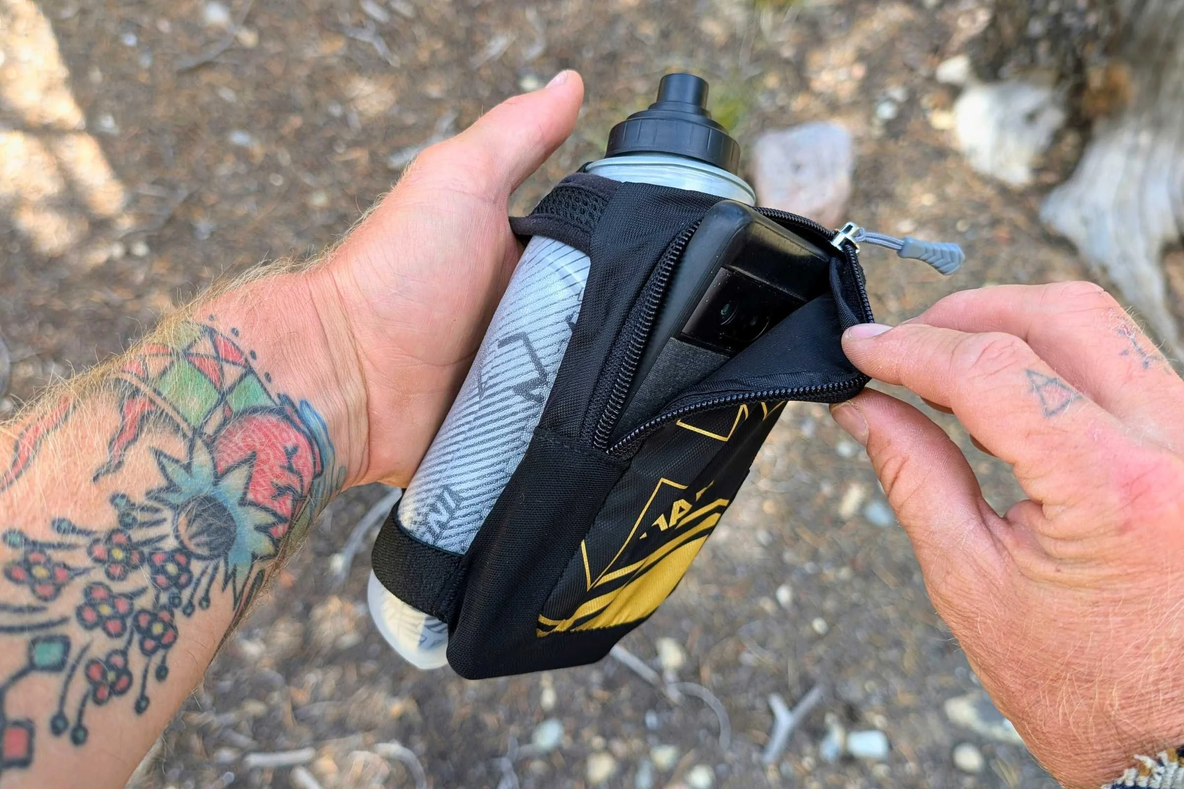 The REI Swiftland Handheld is a pouch with a small exterior pocket to hold a key and a gel or two. The pouch also holds any 500mL soft flask, and it comes with a basic one from HydraPak. It has a left and right-hand strap to fit your hand into. If you want a soft flask handheld that has an exterior pocket but don’t need that pocket to be large enough to hold a phone, this is worth a look.