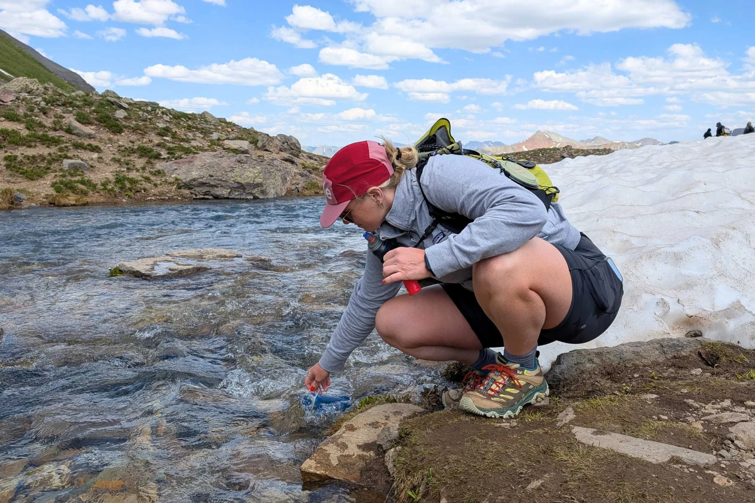 We have used the BeFree filter bottle for years for trail running and backpacking. The hollow fiber membrane filter removes protozoa and bacteria, and the activated charcoal filter, which is new to the BeFree AC, helps with the taste. If you’re drinking from a mountain stream that already tastes good, you can remove the charcoal filter to increase the flow rate. You clean the filter by swishing the hollow fiber membrane section in water, which you can do in a clean mountain stream and with tap water at home.