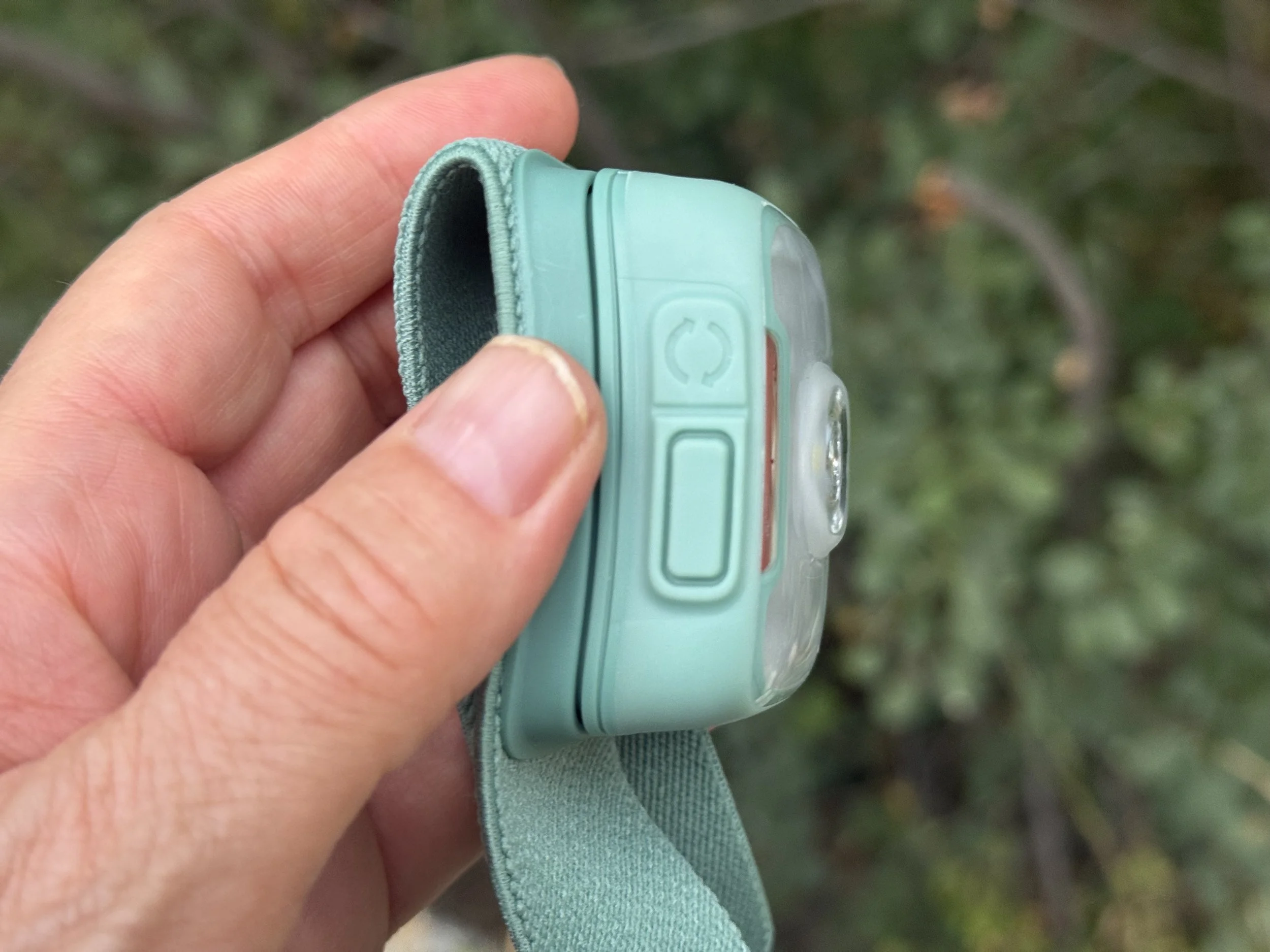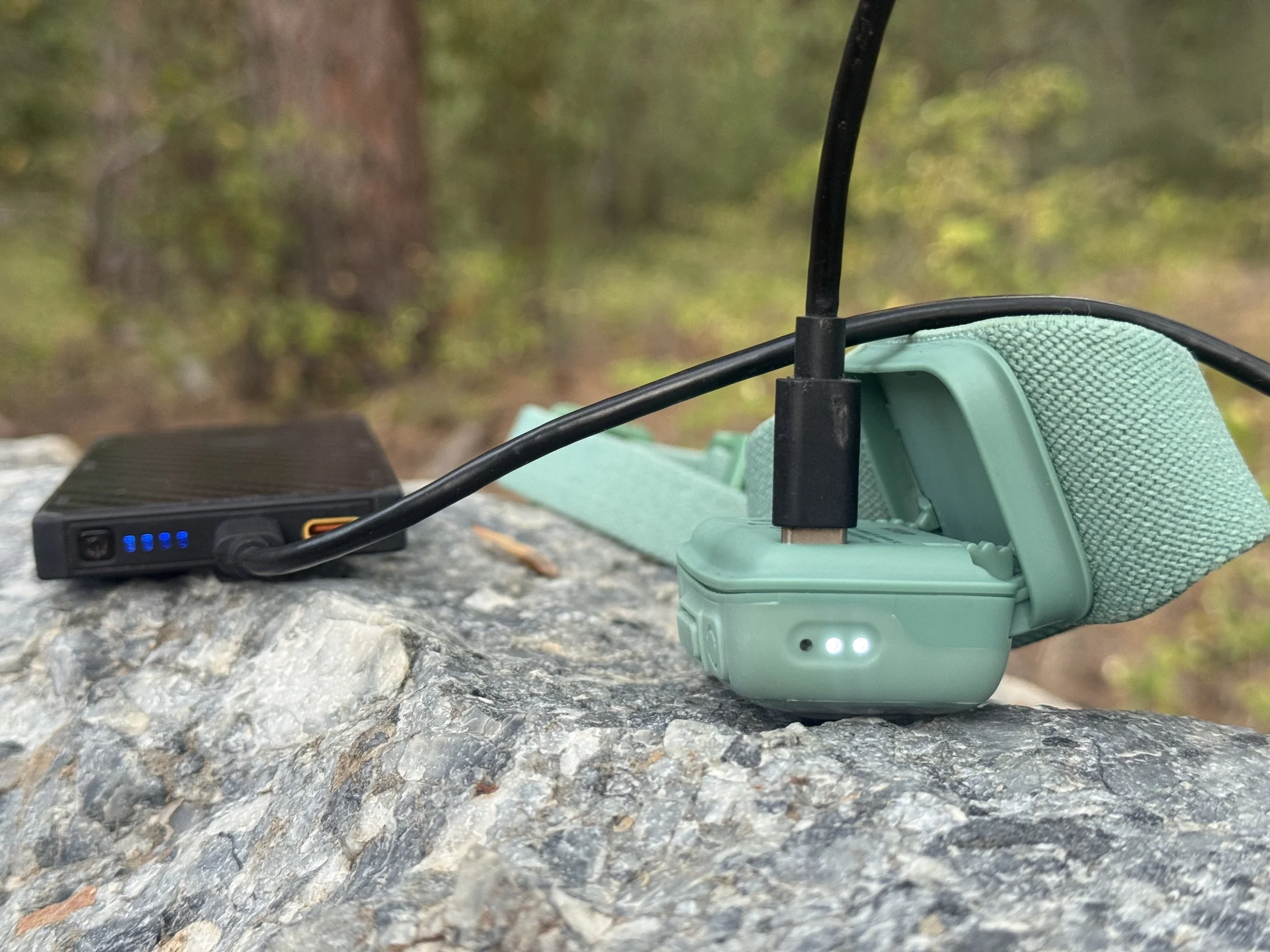 Difficult to pass-through charge. The Range 400 has its charging port behind the tiltable lens/battery unit. It is very difficult to charge the headlamp while wearing it. Given the Range 400’s fast charging capabilities, which allow for 8 minutes of charging to achieve 1 hour of high brightness, pass-through charging is less important.