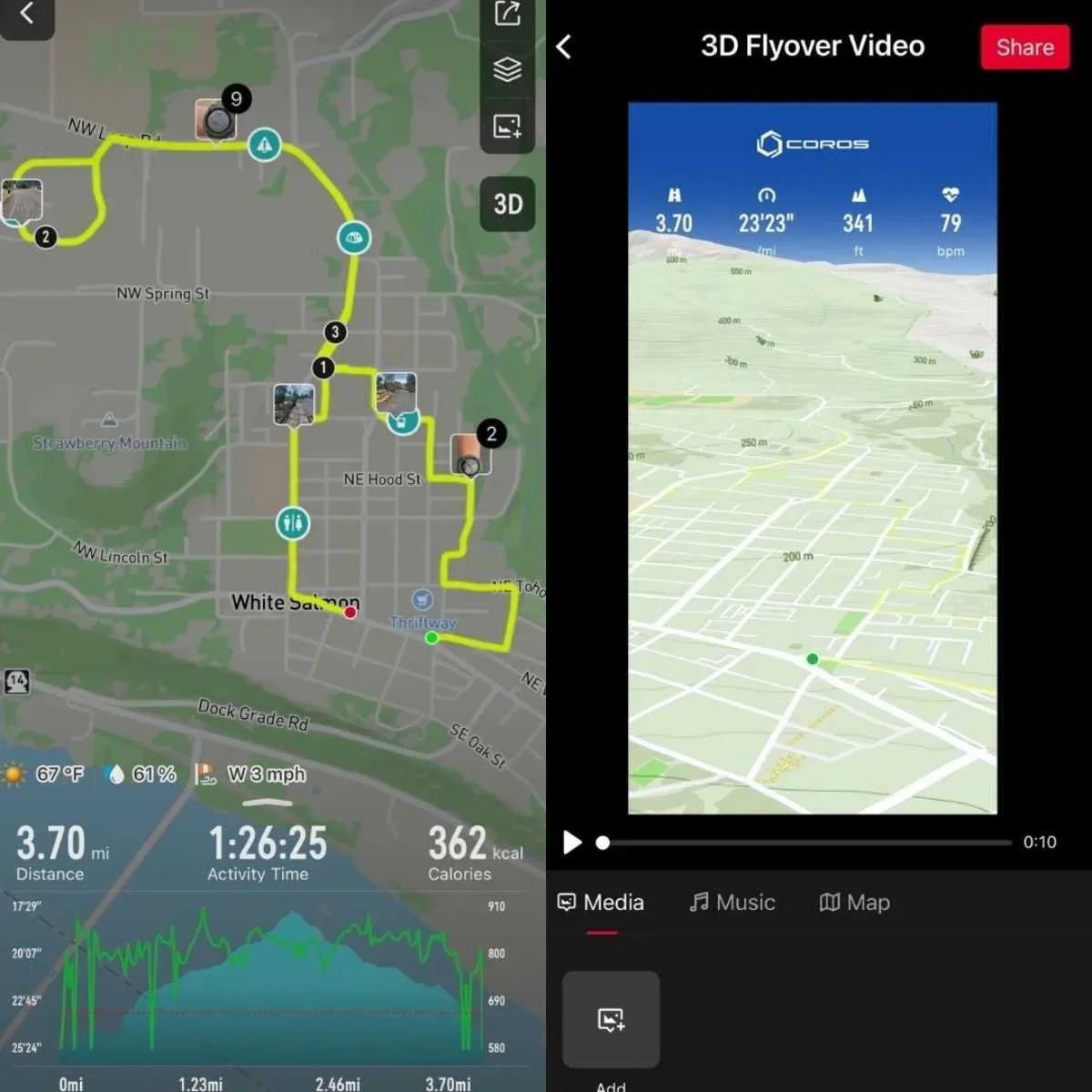 Activity sharing. After an activity, it is easy to share the activity with friends and family, including all photos and pins, even if they don’t have the COROS app.