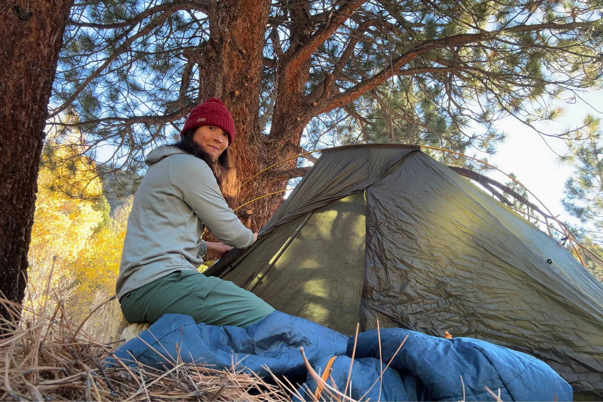 Camping in October in the Eastern Sierra with the Exped DeepSleep 30F bag. Outside the tent, it is cold enough there are some snow patches.