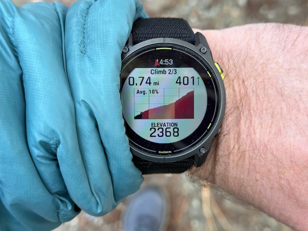 ClimbPro is a feature that splits individual climbs and descents along a predetermined course. ClimbPro shows the distance, ascent/descent, and grade of each upcoming climb or descent. For example, if your hike, run, or ride has several distinct climbs, the watch will show a graph for each climb while underway. Once a specific climb is completed, the watch will show the details for your next climb.