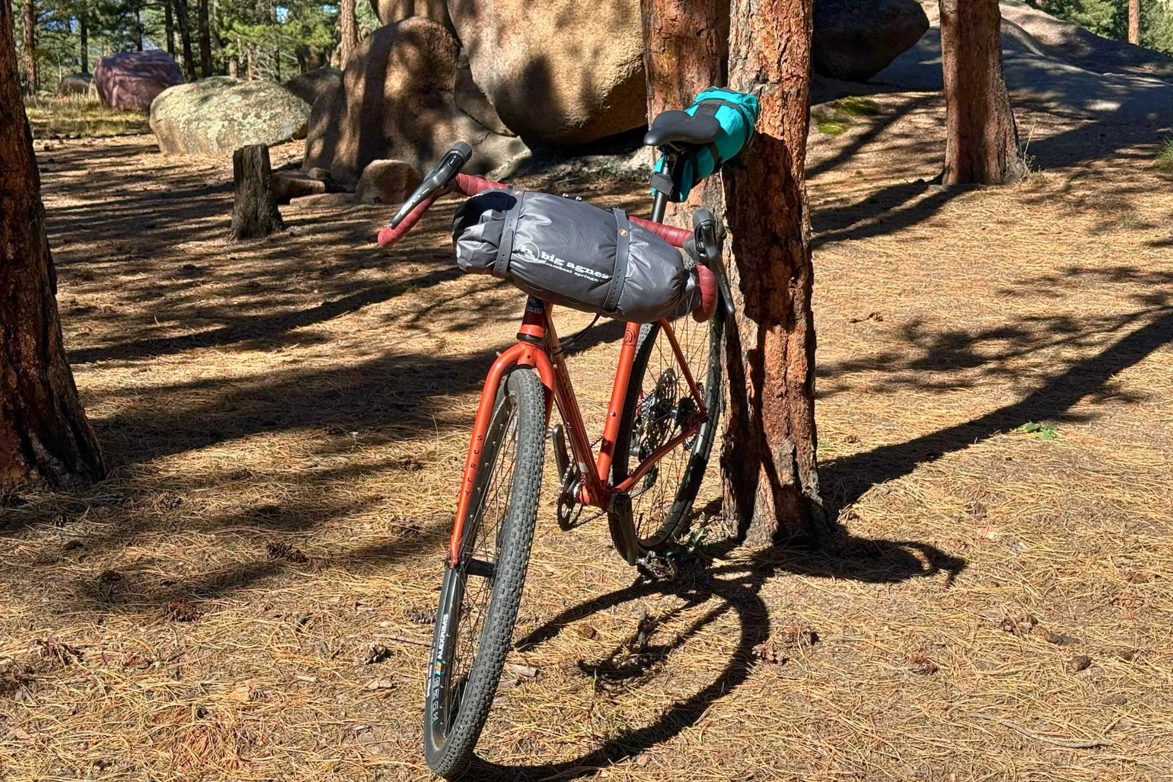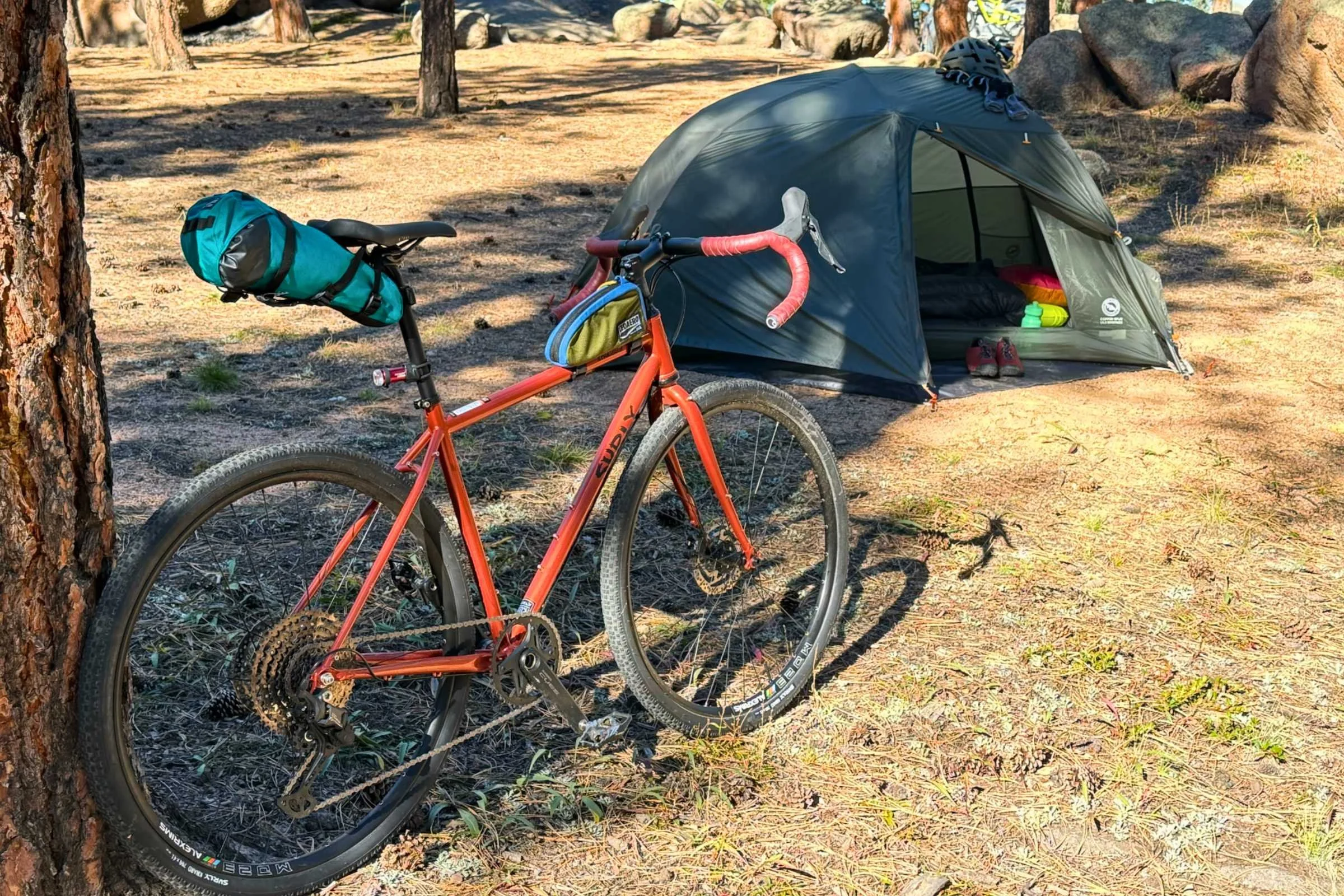 The 50-tooth granny gear was almost too low a gear for most hills we climbed, but we appreciated the CUES hoods and wide Cowchipper drop bars for having enough real estate to attach our Big Agnes Copper Spur tent without interfering with the ability to effortlessly change hand positions for different parts of the ride as we climbed and cruised on the rutty, dry dirt road.