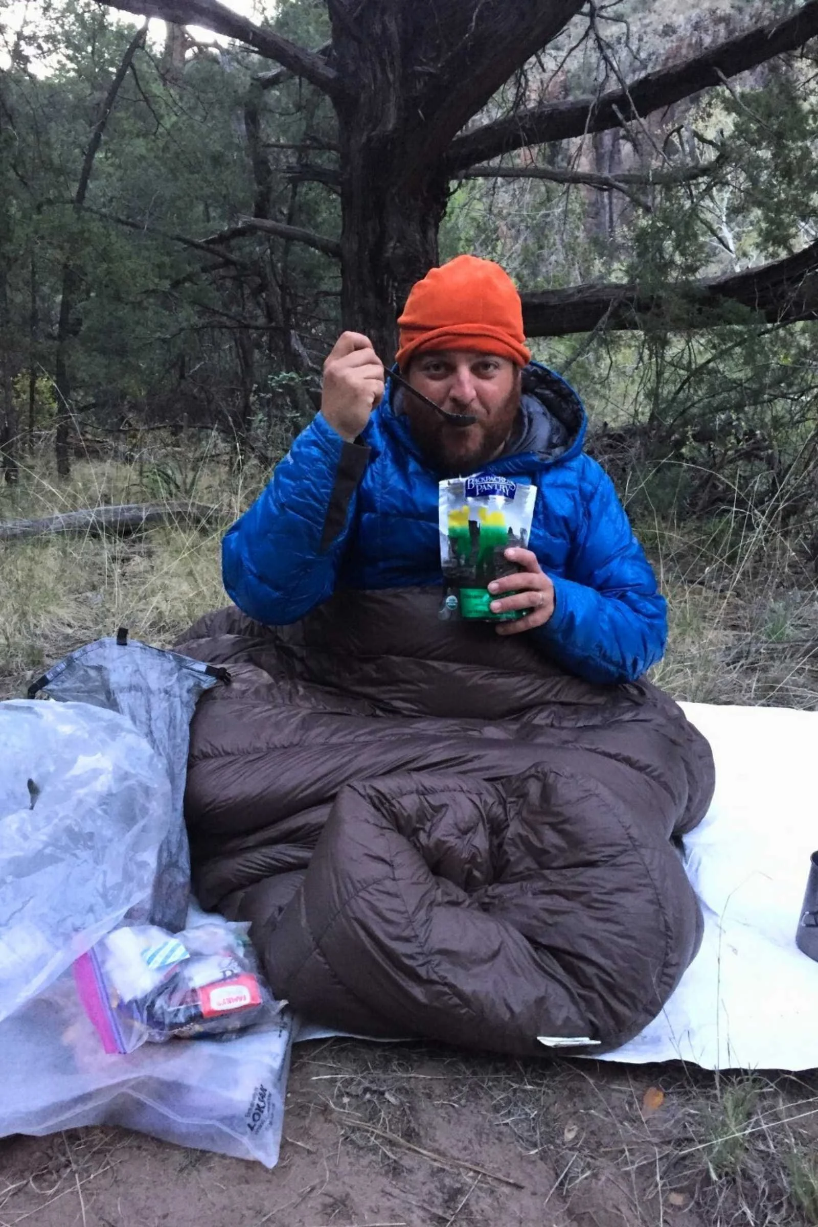 Testing the TOAKS 750 pot on a thru-hike of the rugged Oregon Desert Trail. Our testers cowboy camped (camped under the stars without a tent) and the TOAKS pot is to the left of the sleeping quilt.