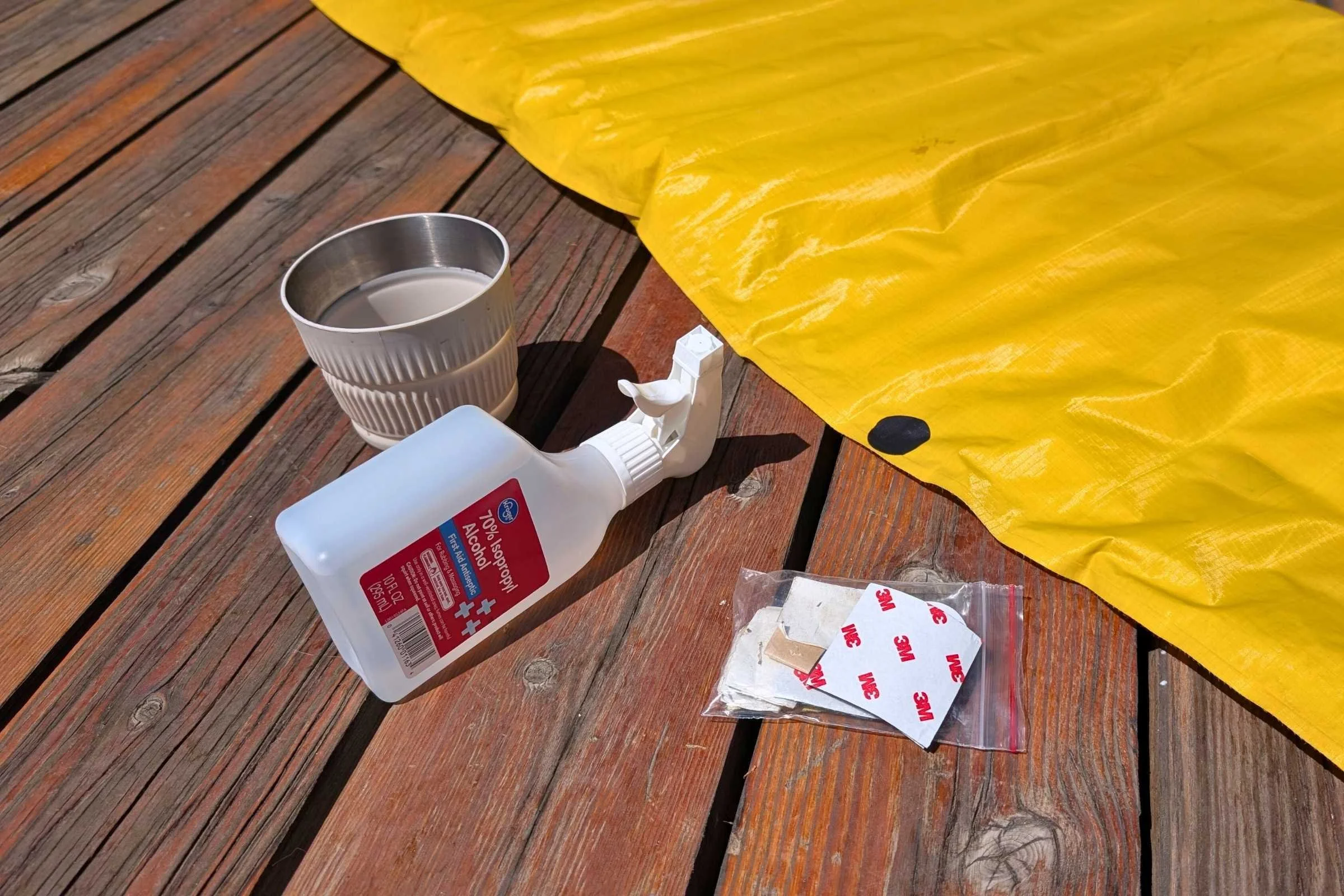 All the materials Sam used to prep his sleeping pad including alcohol sprays to wipe it and some patches from the patch kit.